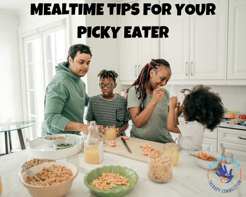 How can you work your schedule to have a least one meal together every other day? We understand that this busy world requires busy people to keep it going. However, when you are overwhelmed and exhausted your child may pick up on that. Children are very intuitive. Incorporating as many mealtimes as possible may assist with parent/child interaction and decreasing anxiety and overwhelming emotions in adults which can in turn make eating less stressful for a “picky eater”.
